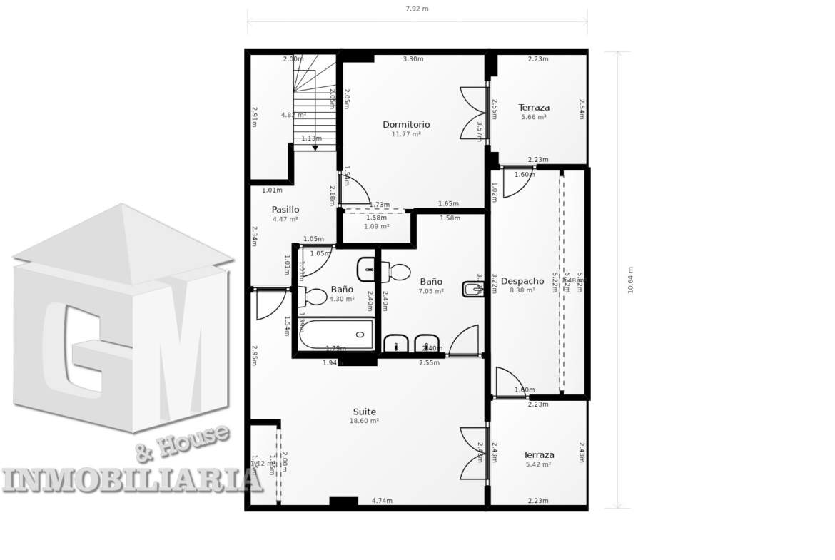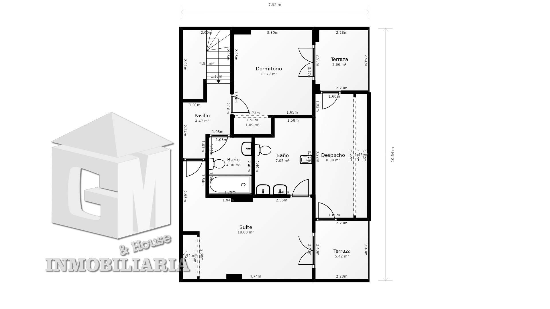 En la planta primera que es donde se ubica la zona de descanso, encontramos dos amplias habitaciones, siendo la principal tipo suite de 18m con baño de 7m y acceso a una terraza de 6m. La habitacion secundaria es bastante grande igualmente con 12m y con salida así mismo a una terraza de 6m. En este caso, el baño de servicio a esta habitacion, se encuentra en el pasillo.