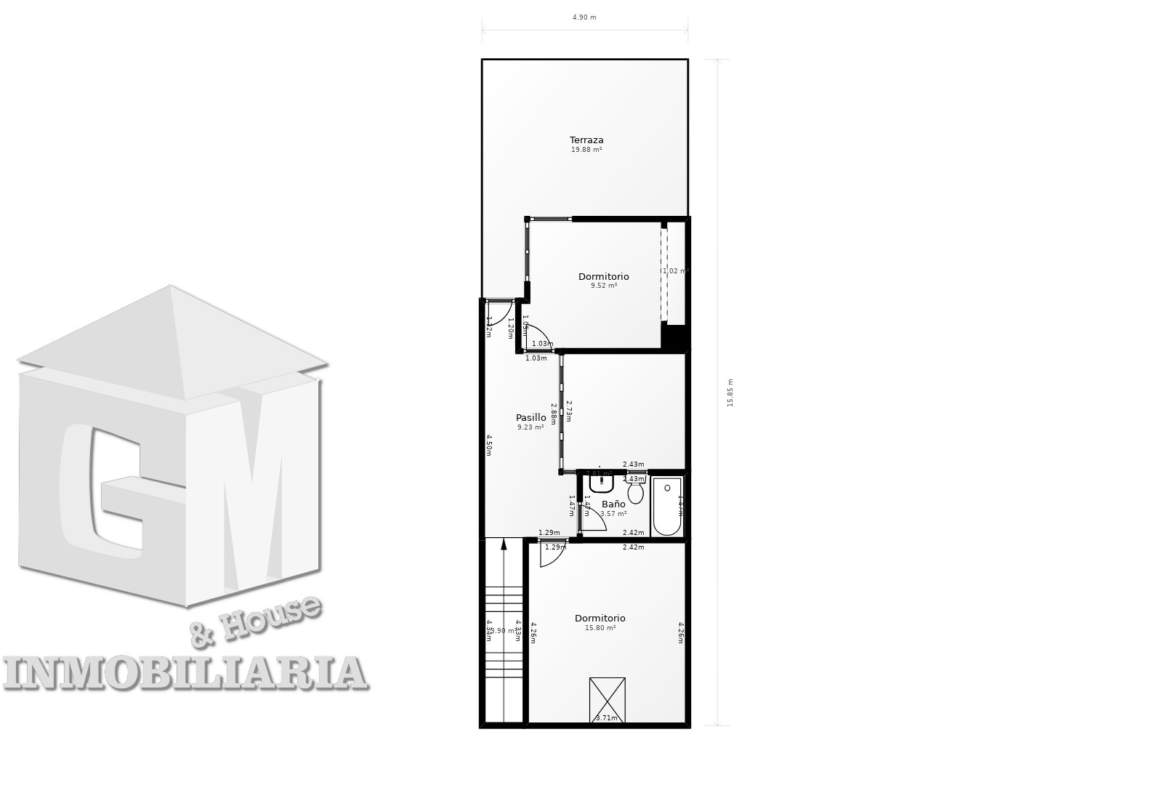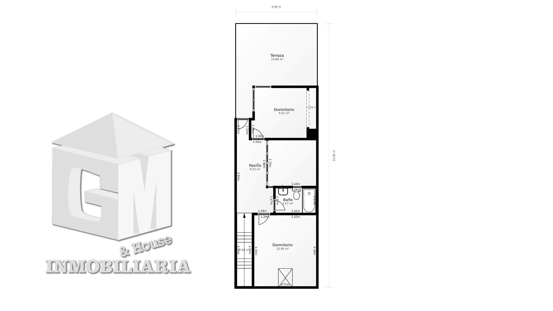 En la planta primera encontramos la zona de descanso, con una habitacion de 16m y otra de 10m, un amplio pasillo de 9m que tiene así mismo las cristaleras que dan al patio interior y el cuarto de baño. Por ultimo pero no menos importante, esta la salido a la terraza de 20m.