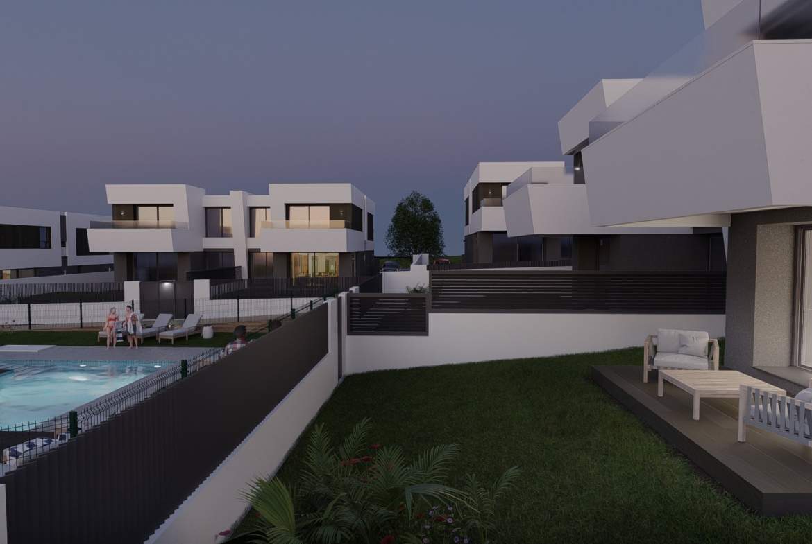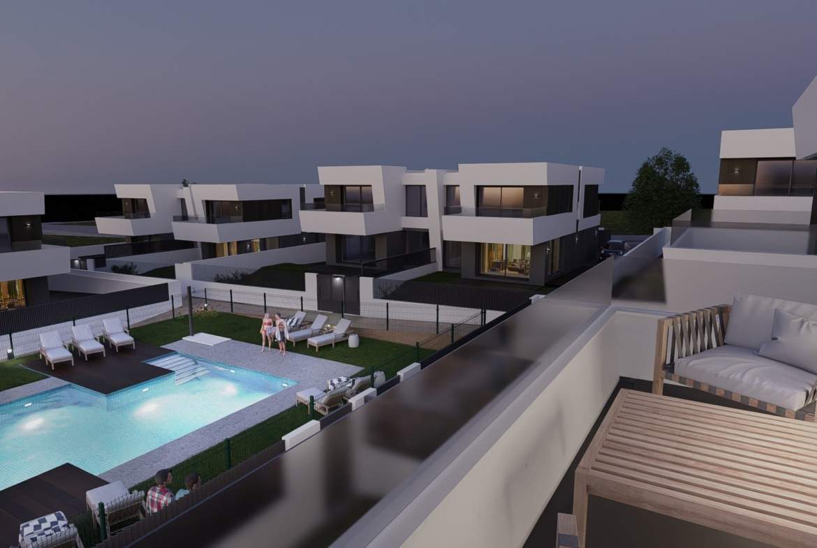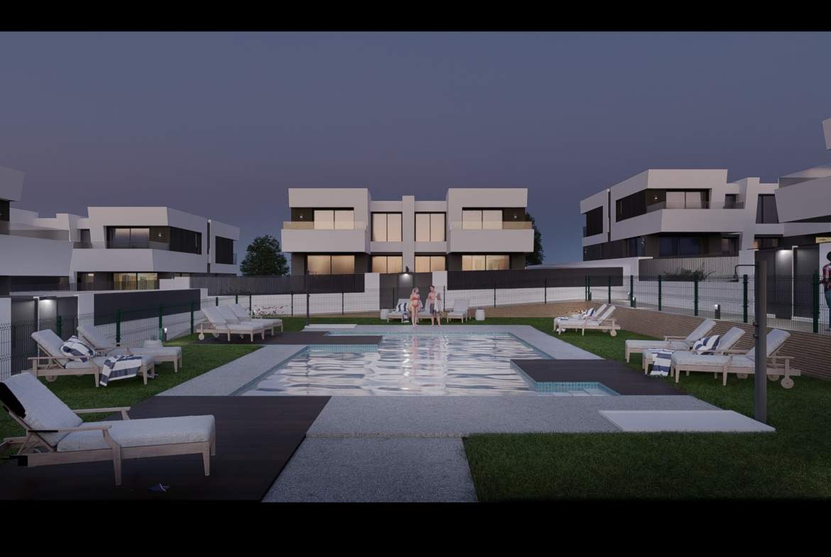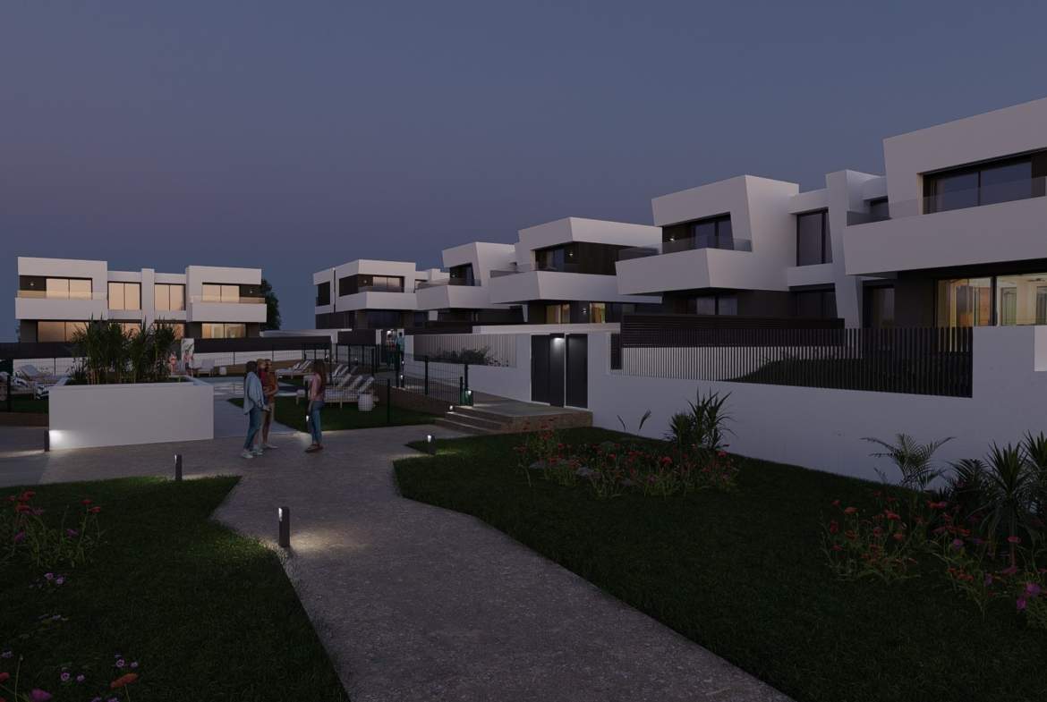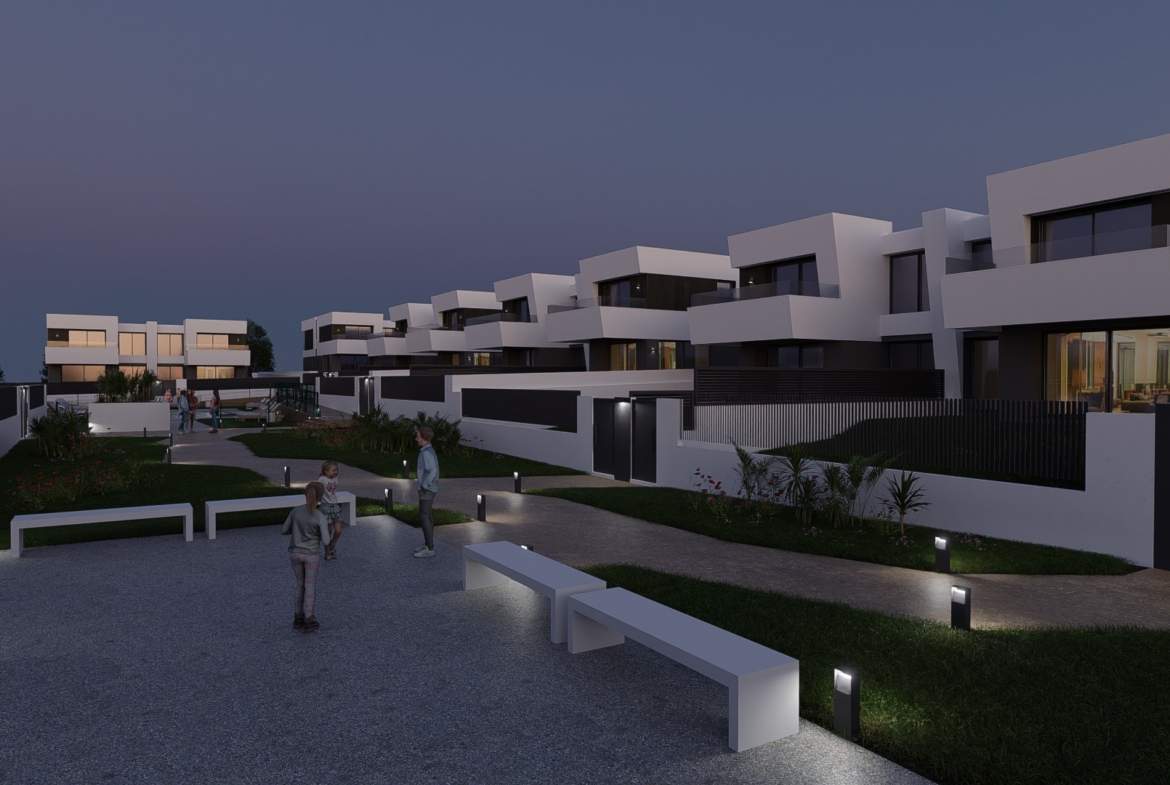 Las viviendas tendrán suelos de porcelánico, carpintería interior lacada en blanco, aerotermia con posibilidad de instalar placas solares fotovoltaicas, ventanas con rotura de puente térmico, puerta de garaje corredera dando acceso a 3 plazas y una estética y acabados dignos de revista.