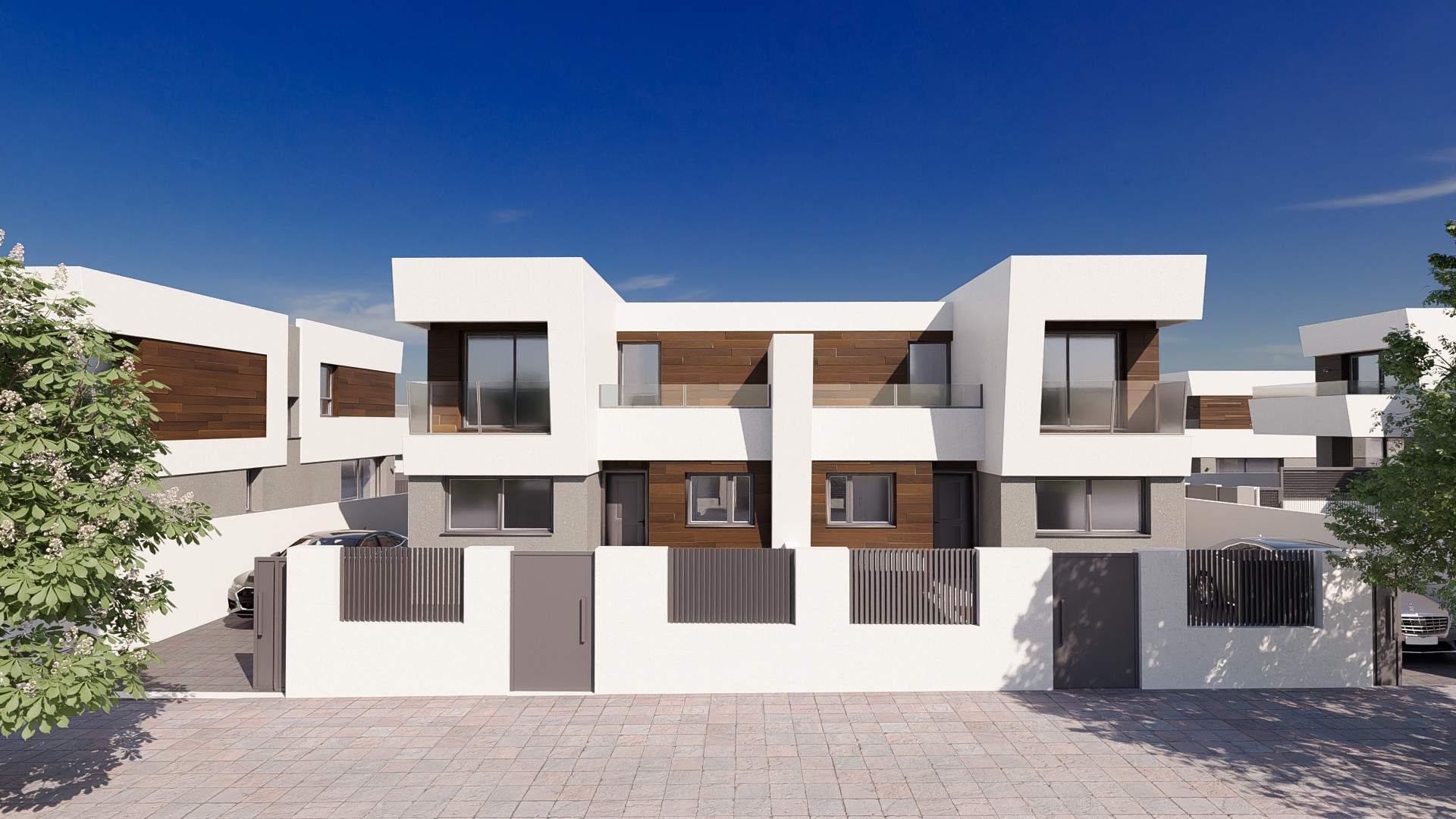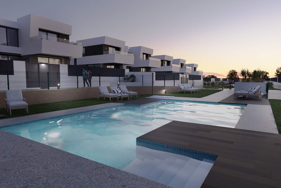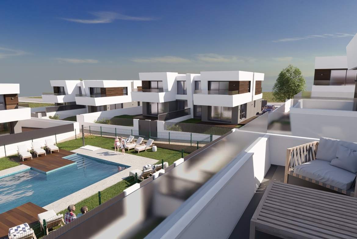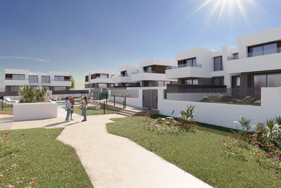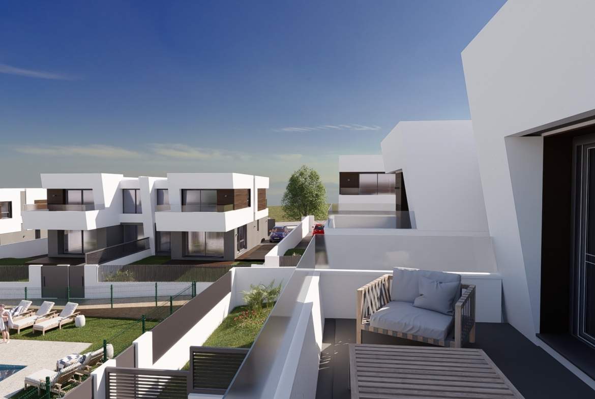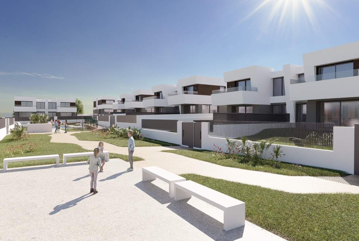 Las viviendas tendrán suelos de porcelánico, carpintería interior lacada en blanco, aerotermia con posibilidad de instalar placas solares fotovoltaicas, ventanas con rotura de puente térmico, puerta de garaje corredera dando acceso a 3 plazas y una estética y acabados dignos de revista.