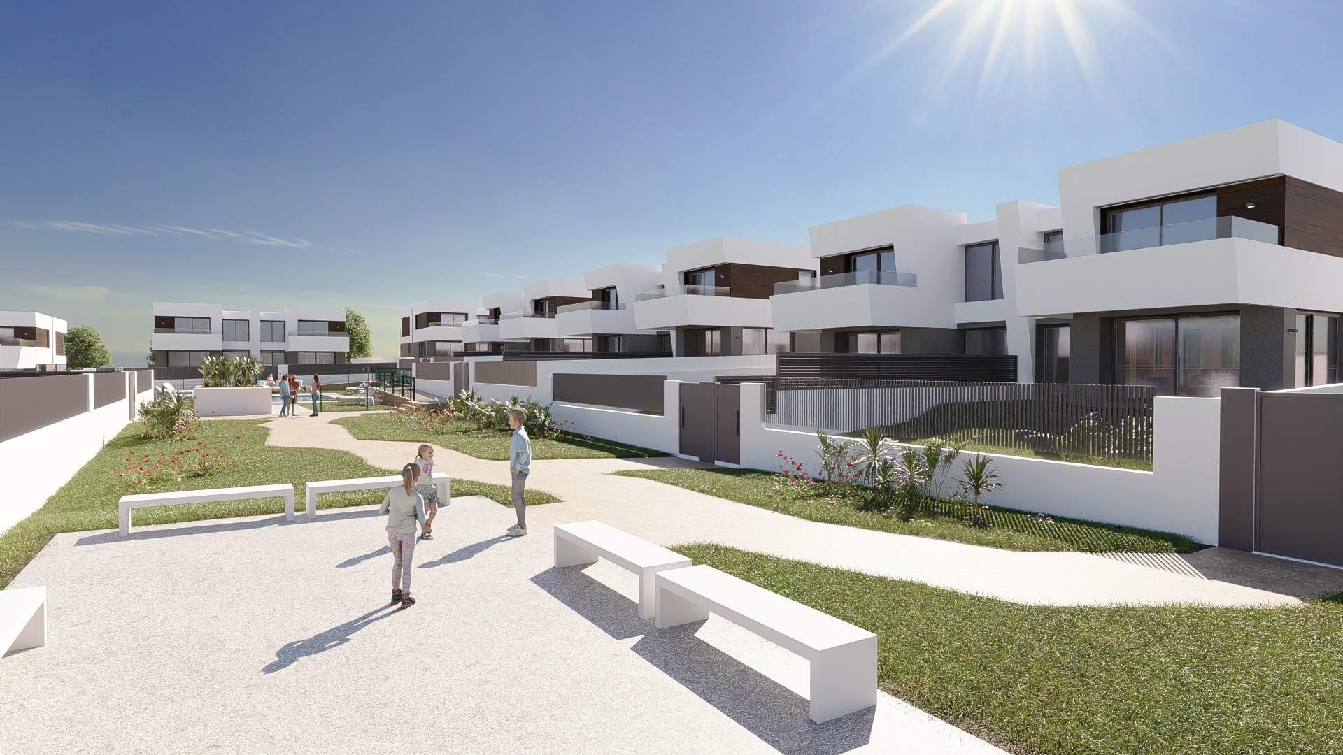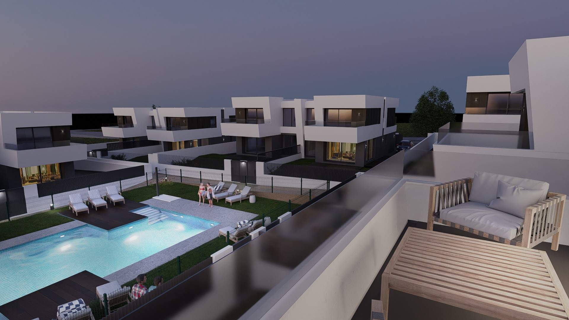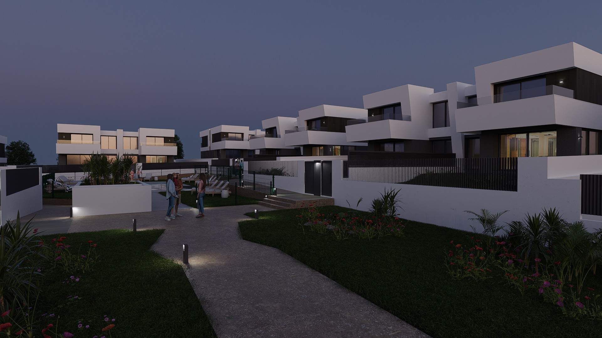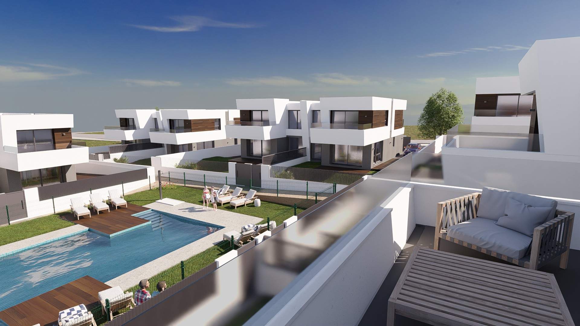 Las viviendas tendrán suelos de porcelánico, carpintería interior lacada en blanco, aerotermia con posibilidad de instalar placas solares fotovoltaicas, ventanas con rotura de puente térmico, puerta de garaje corredera dando acceso a 3 plazas y una estética y acabados dignos de revista.