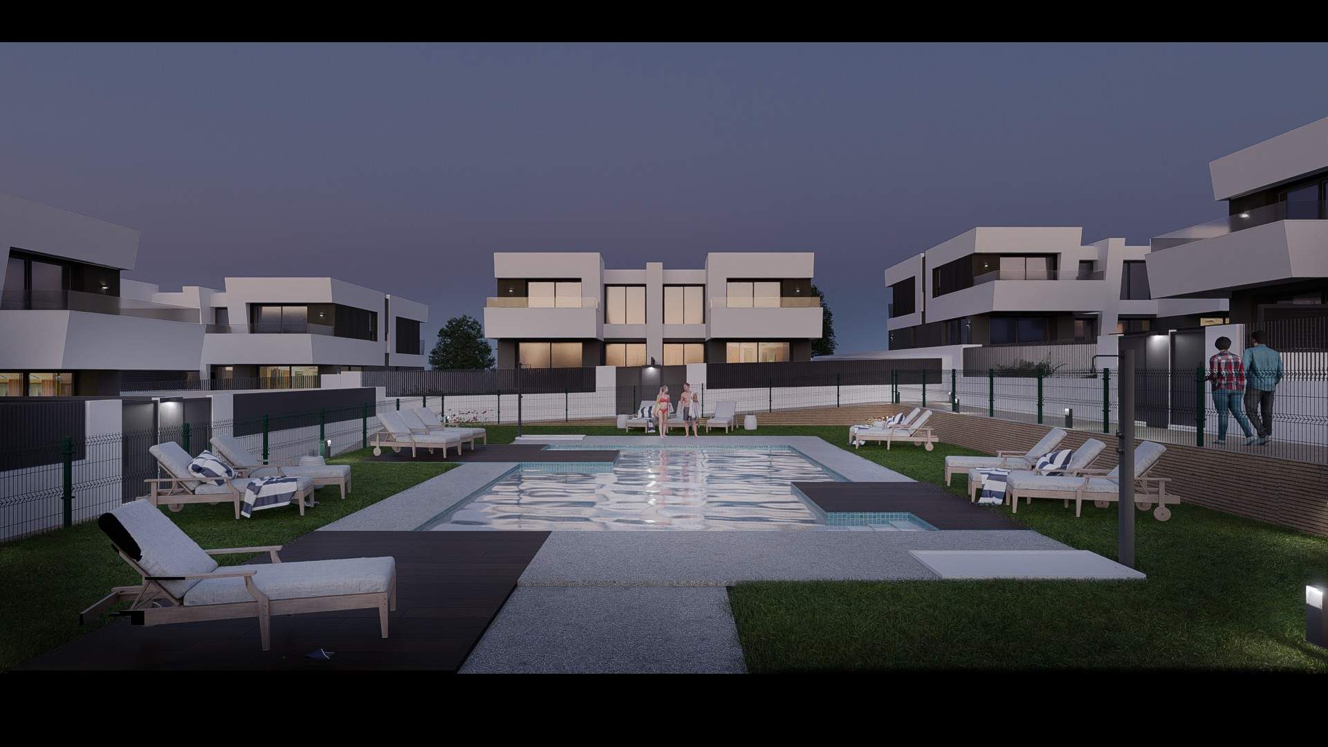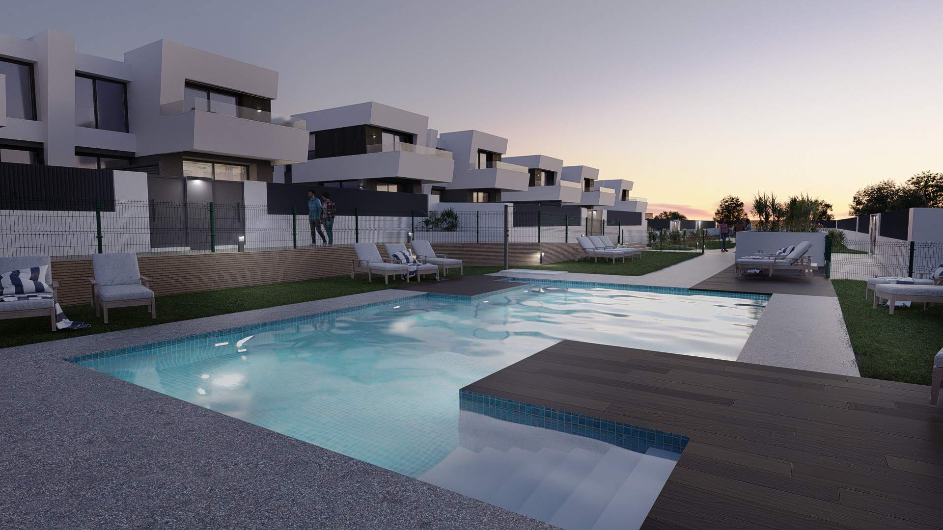 Cuenta así mismo con zona comunitaria con amplia piscina y zona verde y ajardinada a la que se accede desde el jardín privativo de cada vivienda.